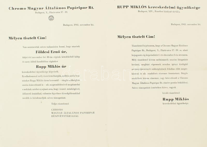 Leírás: 1941 Chromo Magyar Általános Papíripar Részvénytársaság bejelentése Rupp MIklós kereskedelmi ügynökség alkalmazásáról, fejléces nyomtatvány,