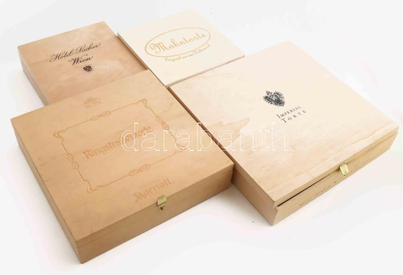 Leírás: 4 darab bécsi fa tortás doboz, klf méretben és márkamegjelöléssel, 29x29 cm alatt