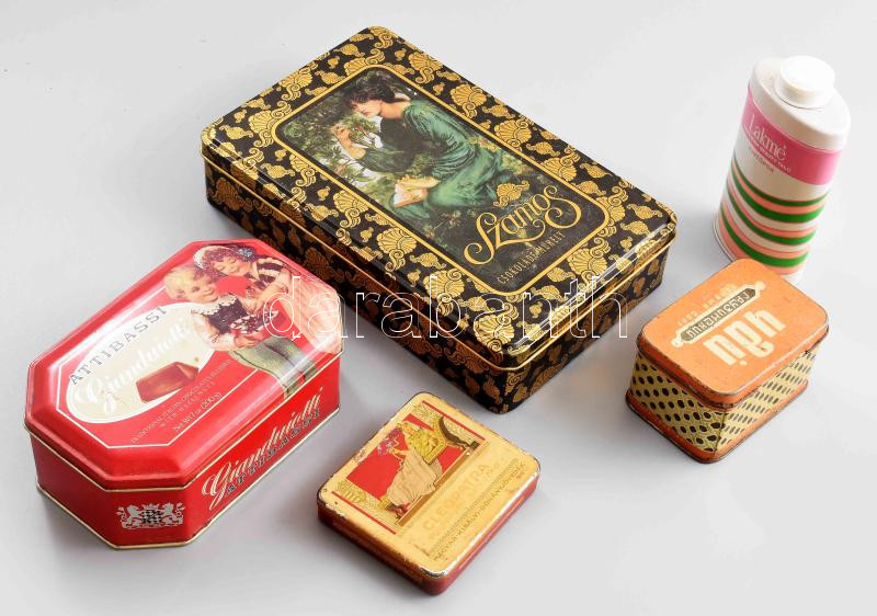Leírás: 5 darab reklám doboz, zömmel fém, közte Lakmé púderes bontatlan, klf méretben, kopással