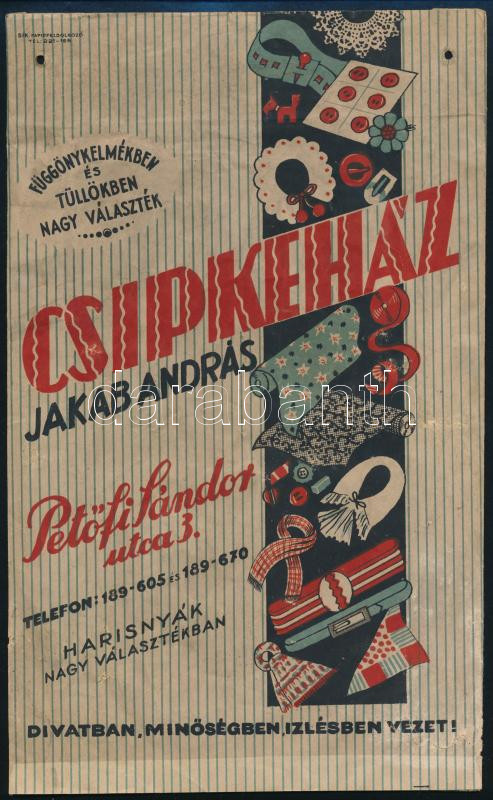 Csipkeház, Jakab András, (Bp.) Petőfi Sándor u. 3. reklám papírzacskó,... https://www.darabanth.com/hu/464-Gyorsarveres/464.0/Mutargy-papirregiseg-egyeb/Reklam~1500001/Csipkehaz-Jakab-Andras-Bp-Petofi-Sandor-u-3-reklam-papirzacsko-fuzes-nelkul-kisebb~II3124139