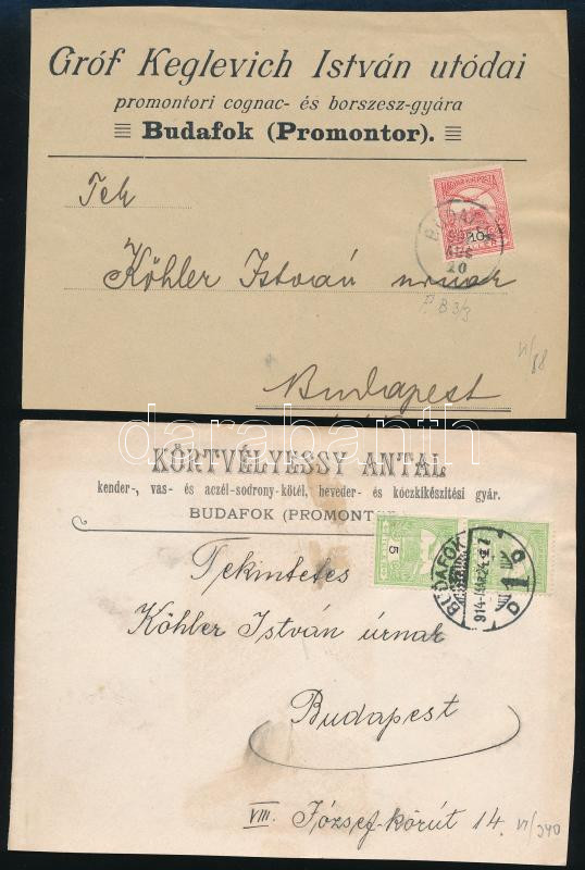 Leírás: Gróf Keglevich István utódai Gyógyszertár és Körtvélyessy Antal sodronygyár fejléces borítékainak előlapjai, 2 db