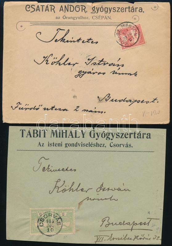 Leírás: Gyógyszertári borítékok előlapjai (Tábit Mihály Gyógyszertára Csorvás, Csatár Andor gyógyszertára Csépa), 2 db