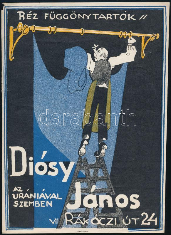 Leírás: Réz függönytartók - Diósy János Rákóczi út 24. reklám, kis sarokhiánnyal, kis szakadással, 24,5×17 cm