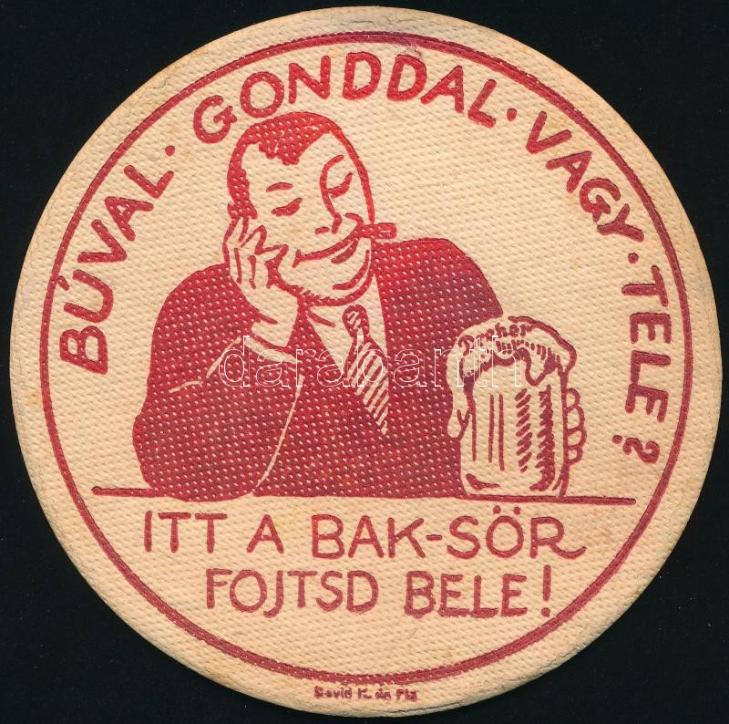 Leírás: cca 1936 "Búval, gonddal vagy tele? Itt a Bak-sör, fojtsd bele!" Bak-sör söralátét, hátoldalon levélüzenettel postán feladva, jó állapotban