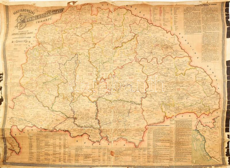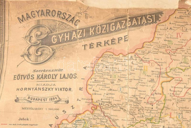 1894 Magyarország egyházi közigazgatási térképe, szerk.: Eötvös Károly Lajos, kiadja: Hornyánszky, 1:900 000, vászontérkép, megviselt állapotban, 73×100 cm