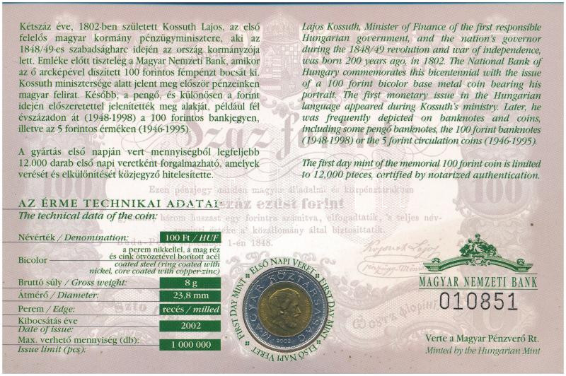 Leírás: 2002. 100Ft Ni-Cu-Zn "Kossuth" elsőnapi veret sorszámozott "010851" díszlapon T:UNC