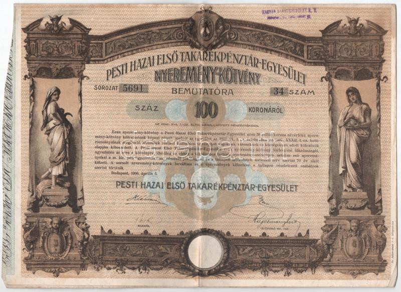 Budapest 1906. "Pesti Hazai Első Takarékpénztár-Egyesület" nyereménykötvénye 100K-ról, szárazpecséttel, nyereményszelvénnyel, felülbélyegzéssel T:F folt