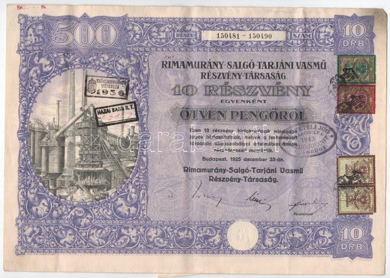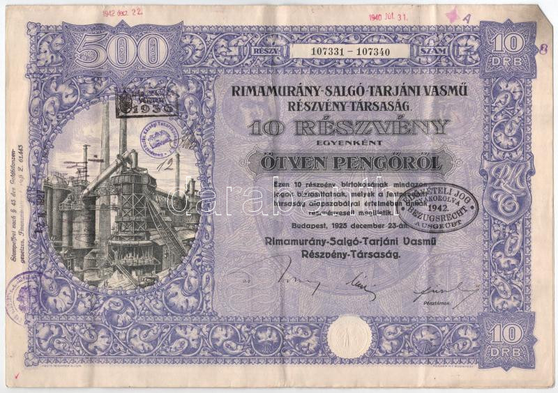 Leírás: Budapest 1925. "Rimamurány-Salgó-Tarjáni Vasmű Részvény-Társaság" 10db részvénye egyben, egyenként 50P-ről, szárazpecséttel, bélyegzésekkel, szelvényekkel, egyik okmánybélygekkel (2x) T:F