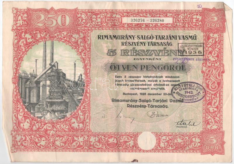 Leírás: Budapest 1925. "Rimamurány-Salgó-Tarjáni Vasmű Részvény-Társaság" 5db részvénye egyben, egyenként 50P-ről, szárazpecséttel, bélyegzésekkel, szelvényekkel T:F