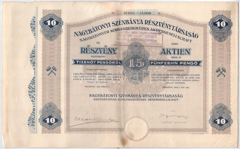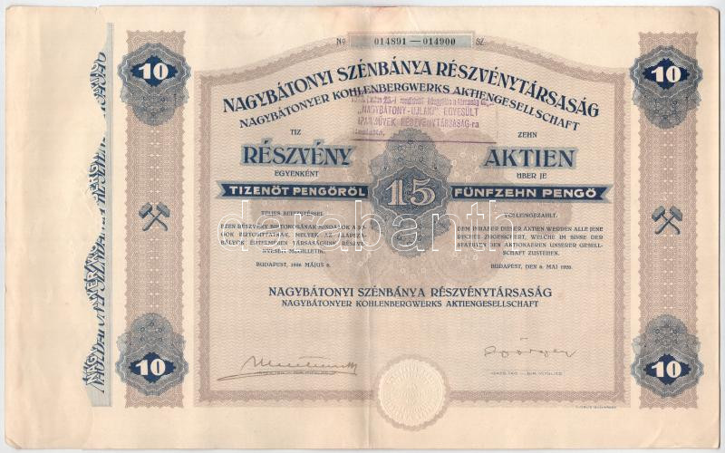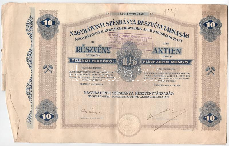 Leírás: Budapest 1926. "Nagybátonyi Szénbánya Részvénytársaság" tíz részvénye egyben, egyenként 15P-ről, szárazpecséttel, bélyegzéssel (3x), közte sorszámkövetők T:F foltos