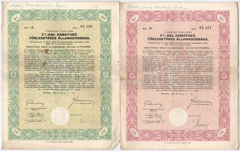 Budapest 1942. "A Magyar Királyság 3%-kal kamatozó törlesztéses államadóssága" 25P-ről és 500P-ről (2xklf) szárazpecséttel, szelvényekkel, vízjeles papíron T:F folt