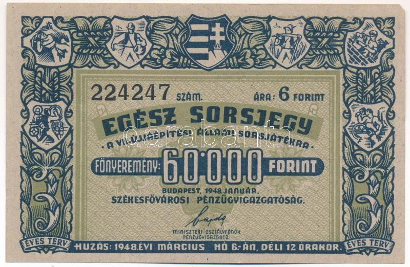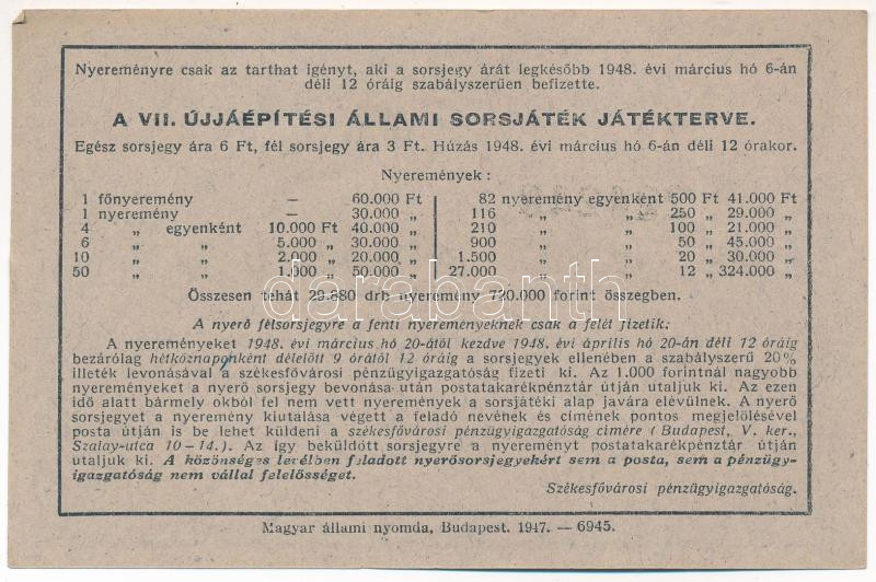 Leírás: Budapest 1948. "Egész sorsjegy - VII. Újjáépítési Állami sorsjáték" vízjeles papíron T:AU