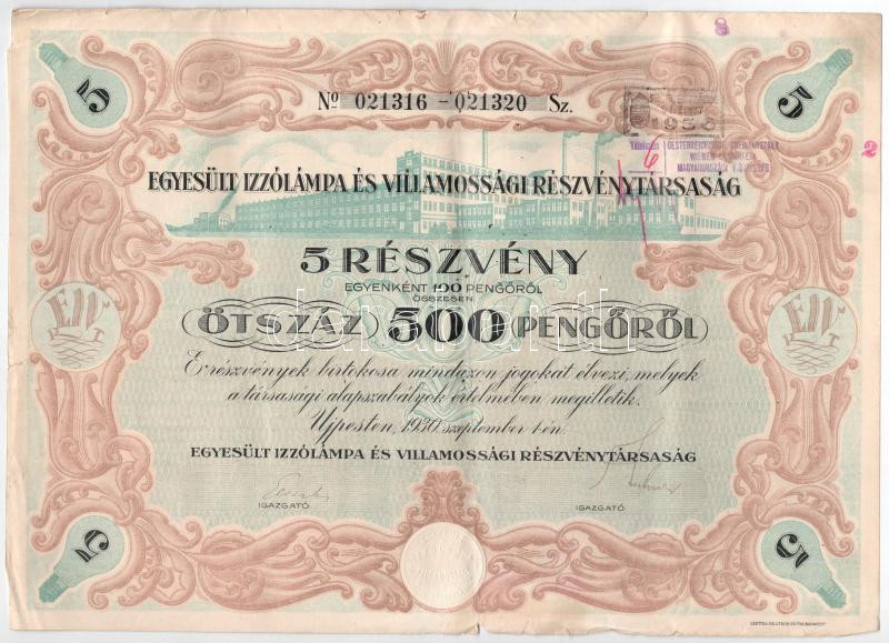 Leírás: Újpest 1930. "Egyesült Izzólámpa és Villamossági Részvénytársaság" 10 részvénye egyben, összesen 1000P-ről, szárazpecséttel, szelvényekkel + 5 részvénye egyben, összesen 500P-ről, szárazpecséttel, szelvényekkel (2x) sorszámkövetők T:F kisebb szakadás