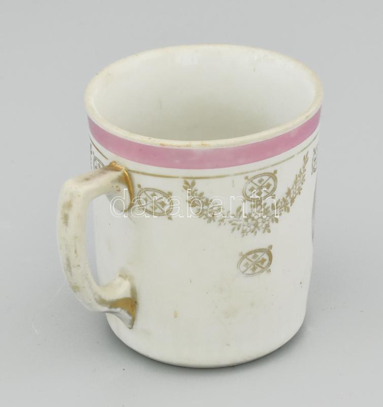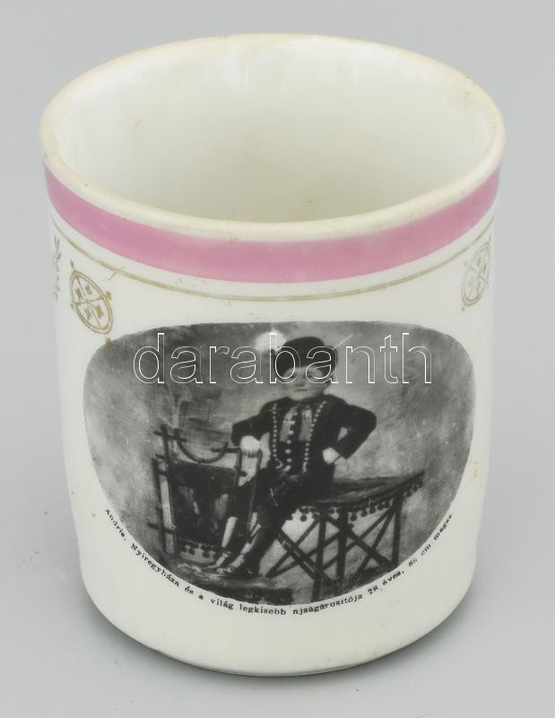 Leírás: Antik bögre, "Andris, Nyíregyháza és a világ legkisebb újságárusítója, 28 éves, 85 cm magas" szöveggel és ábrázolással. Kopással, m: 8,5 cm