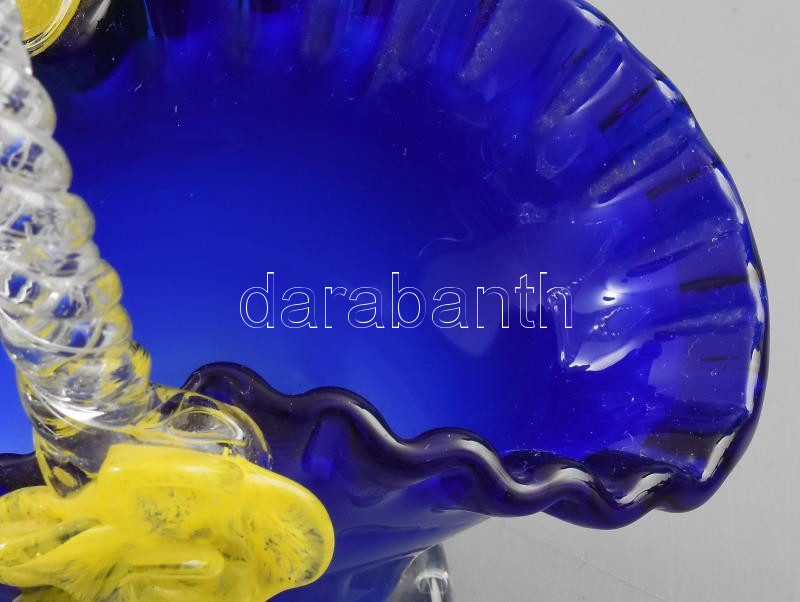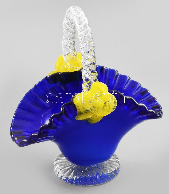 Leírás: Antik cseh kosár alakú üveg asztaldísz. Anyagában élénk színekkel színezett, jelzés nélkül, hibátlan, m: 15,5 cm