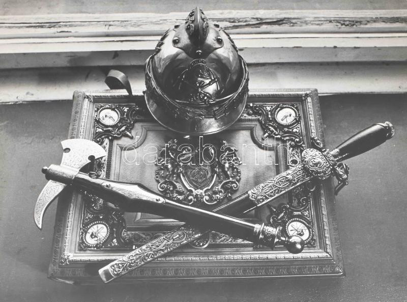 Kútvölgyi Mihály (1944-2023): Tűzoltó ereklyék (cím nélkül). Kútvölgyi Mihály fotóművészeti alkotása. Nagyméretű fotó, jelzés nélkül, sarka kissé sérült, 30x39,5 cm