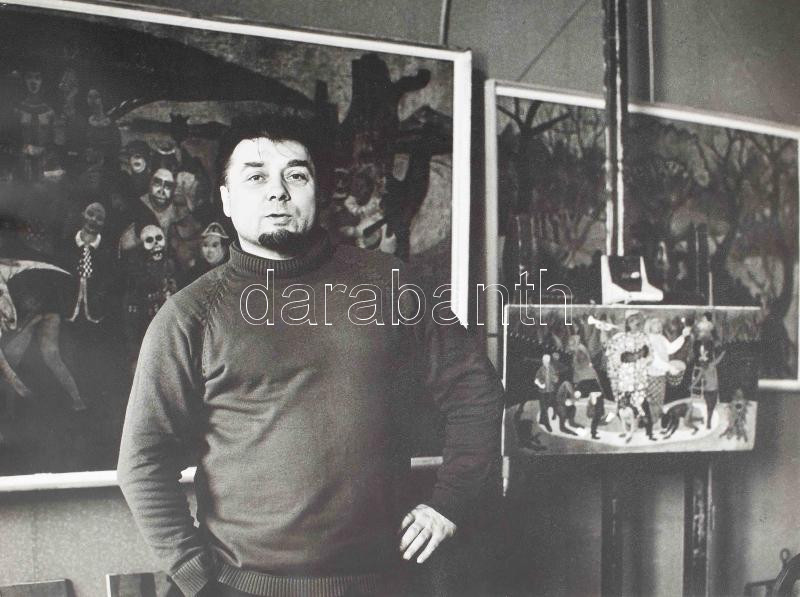 Kútvölgyi Mihály (1944-2023) fotóművész felvétele egy ismeretlen festőművészről, háttérben alkotásaival. Nagyméretű fotó, jelzés nélkül, kisebb saroktöréssel, 30x40 cm