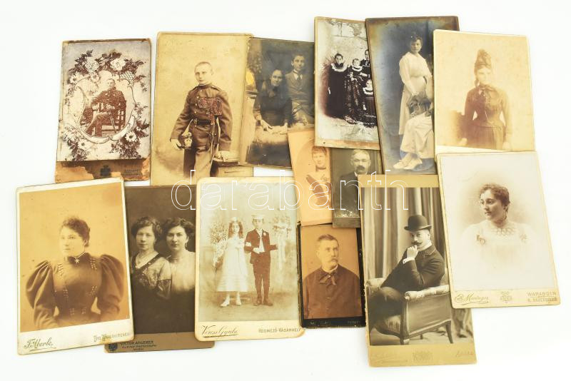 Vegyes keményhátú fotó tétel (közte katonafotók is), össz. 14 db, különböző műtermekből (Victor Angerer Bécs, Hauser Béla Kispest, Langsfeld Mór Kaposvár, stb.), változó méretben és állapotban