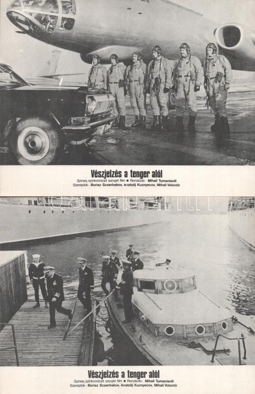 cca 1985 előtti ,,Visszajelzés a tenger alól" című szovjet film jelenetei és szereplői, 6 db produkciós filmfotó (vitrinfotó, lobbyfotó) nyomdatechnikával sokszorosítva kartonpapírra, egyoldalas nyomással, a használatból eredő (esetleges) kisebb hibákkal, 18x24 cm