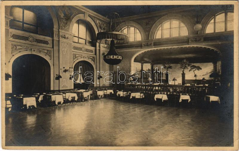 Leírás: Wien, Vienna, Bécs; Konzert und Tanzsaal in Romei Trost's Etablissement "Türkenschanzpark" Dienstag, Donnerstag, Sanstag u. Sonntag moderner Tanz - Jazzband / Concert and dance hall, interior. Foto Réja (EK)