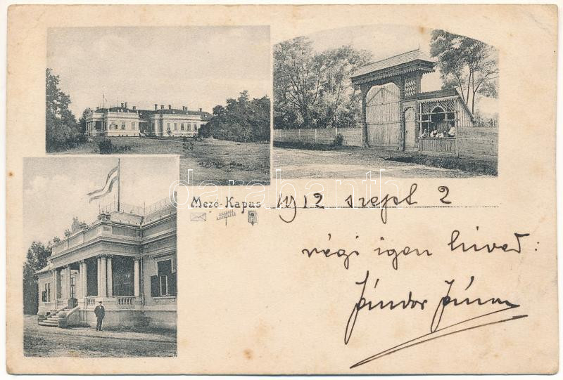 Leírás: 1912 Mezőkapus, Capusu de Campie (Kisikland, Iclanzel); Sándor kúria, kastély, Székelykapu / Székely gate (Poarta secuiasca), castle (EB)