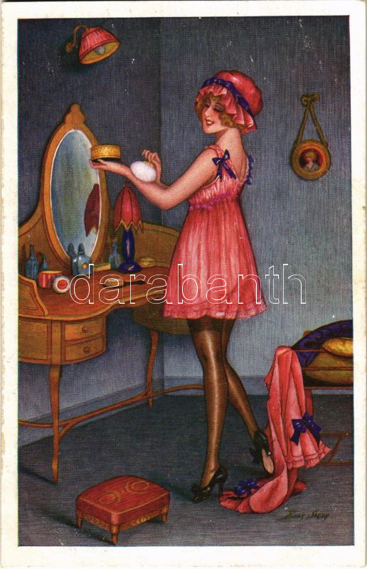 Leírás: Cabinet de Toilette. Fantaisies trichromes. Paris, A. Noyer Serie No. 148. / French gently erotic lady art postcard s: Xavier Sager