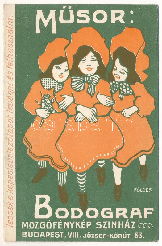 Leírás: Bodograf mozgófénykép színház (mozi) reklámja. Budapest VIII. József körút 63. / Hungarian cinema advertisement s: Földes (EK)