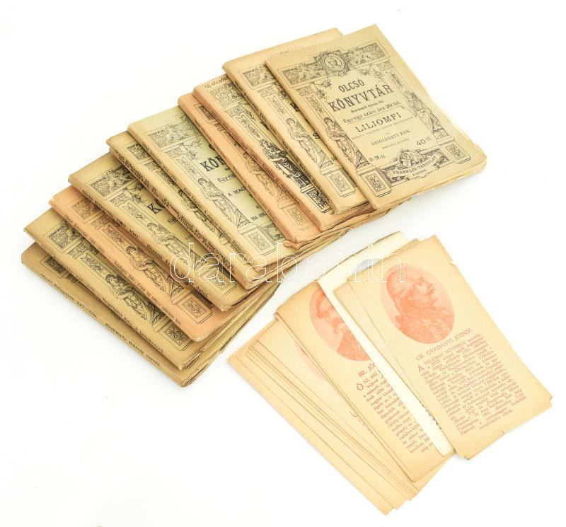 Az Olcsó Könyvtár sorozat 11 száma: Szigligeti Ede: Liliomfi.; Ten Brink Bernát: Shakspere.; Collins Vilmos: Sophokles.; Boyesen H. Hjorth: Goethe Faustja.; stb. Bp., 1881-1916, Franklin-Társulat. Kiadói papírkötés, vegyes állapotban. + Németh József könyv-, mű-, zenekereskedés híres magyarokat bemutató reklámnyomtatványai, 21 db