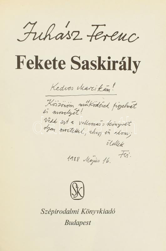 Juhász Ferenc: Fekete Saskirály. A szerző, Juhász Ferenc (1928-2015) által DEDIKÁLT! Bp., 1988., Szépirodalmi. A borító illusztrációja Hantai Simon munkája. Kiadói kartonált papírkötés, kiadói kissé kopott papír védőborítóban.