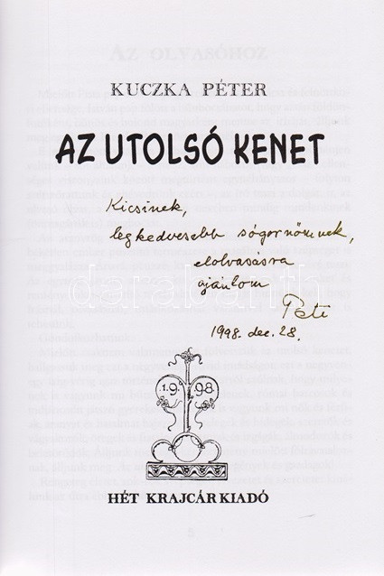 Dedikált: ,,Kicsinek, legkedvesebb sógornőmnek, elolvasásra ajánlom: Peti. 1998. dec. 28."