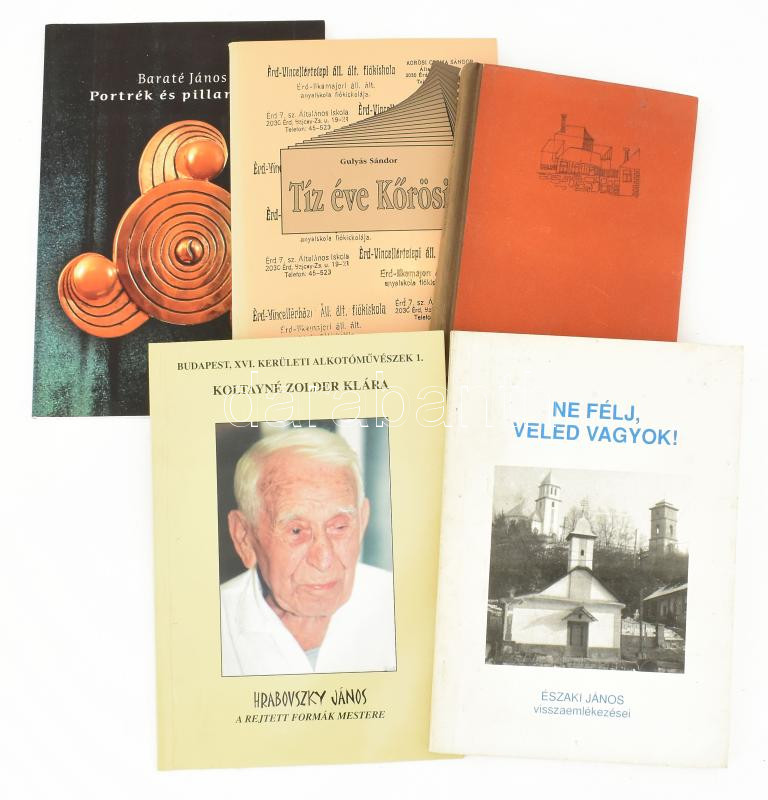Vegyes dedikált könyvtétel, 5 db: Gulyás Sándor: Tíz éve Kőrösi. Az iskolatörténet bővített kiadása. DEDIKÁLT. Érd, 2003, Kőrösi Csoma Sándor Általános Iskola - Vincellér Alapítvány. Kiadói papírkötés.; Baráth Lajos: Házak tábla nélkül. DEDIKÁLT! Bp., 1963., Magvető. Kiadói félvászon-kötés.; Koltayné Zolder Klára: Hrabovszky János. A rejtett formák mestere. Bp., 2000, Képíró Kft. Kiadói papírkötés.; Kisfalusi János: Ne félj, veled vagyok! Északi János visszaemlékezései. DEDIKÁLT! [Rakaca, 1993.], Magánkiadás. Kiadói papírkötés.; Baraté János: Portrék és pillanatok. Vál.: Baraté Jánosné. Baraté Jánosné által DEDIKÁLT! hn.,én., Magánkiadás. Kiadói papírkötés.;