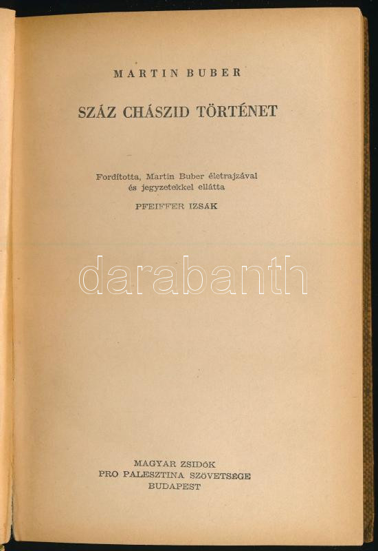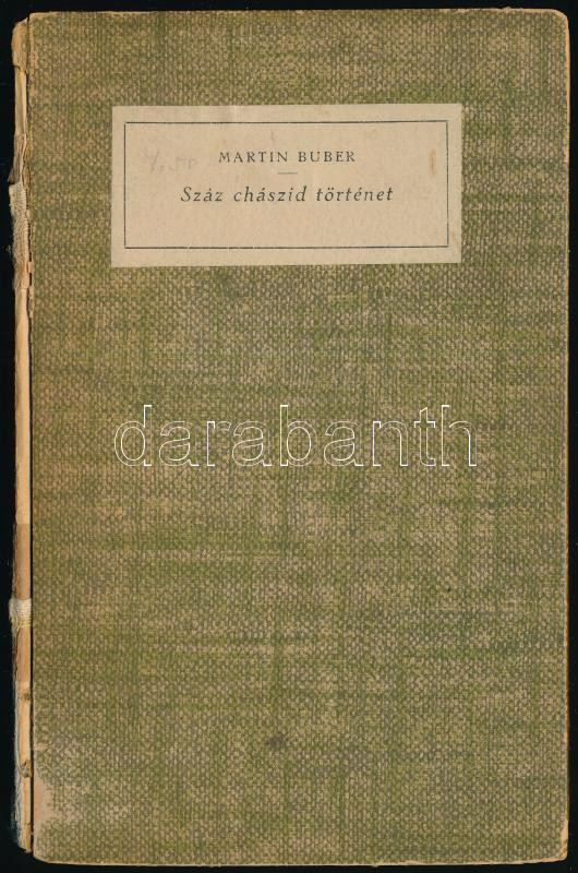 Martin Buber: Száz chászid történet. Ford., - - életrajzával és jegyzetekkel ellátta Pfeiffer Izsák. Javne könyvek 9. Bp.,[1943.],Magyar Zsidók Pro Palesztina Szövetsége, 156 p. Kiadói kartonált papírkötés, kopott borítóval, sérült, hiányzó gerinccel, részben szétvált könyvtesttel.