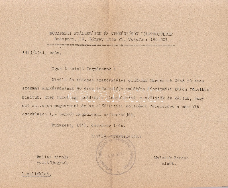 Kiadványunkban elhelyezve a ,,Budapesti Szállodások és Vendéglátósok Ipartestülete körbélyegzőjével hitelesített aprónyomtatvány a kiadvány utólagos megrendelőlapjaként.