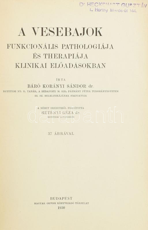 Korányi Sándor: A vesebajok funkcionális pathologiája és therapiája klinikai előadásokban. Ford.: Hetényi Géza. Magyar Orvosi Könyvkiadó Társulat Könyvtára CXXV. köt. Bp., 1930, Magyar Orvosi Könyvkiadó Társulat, X+309 p. Első kiadás. Kiadói papírkötés, az elülső borító hiányzik, a hátsó borító felső sarkán hiánnyal.