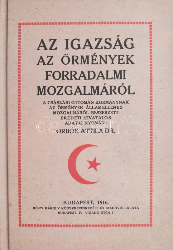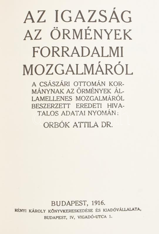 Orbók Attila: Az igazság az örmények forradalmi mozgalmáról. A császári ottomán kormánynak az örmények államellenes mozgalmáról beszerzett eredeti hivatalos adatai nyomán: - -. Bp., 1916, Szófia. Reprint kiadás. Kiadói kartonált papírkötés.
