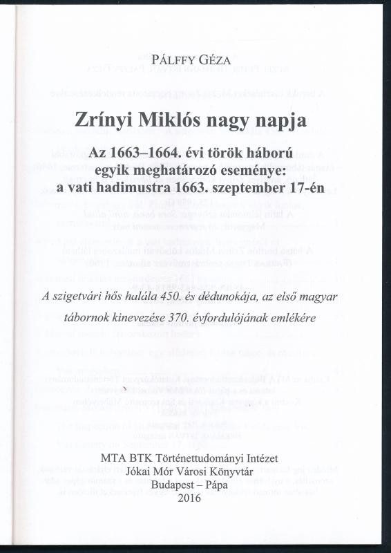 Pálffy Géza: Zrínyi Miklós nagy napja. Az 1663-1664. évi török háború egyik meghatározó eseménye: a vati hadimustra 1663. szeptember 17-én. Bp.-Pápa, 2016, MTA BTK Történettudományi Intézet - Jókai Mór Városi Könyvtár, 58 p.+ 1 (kihajtható térkép) t. Kiadói papírkötés.