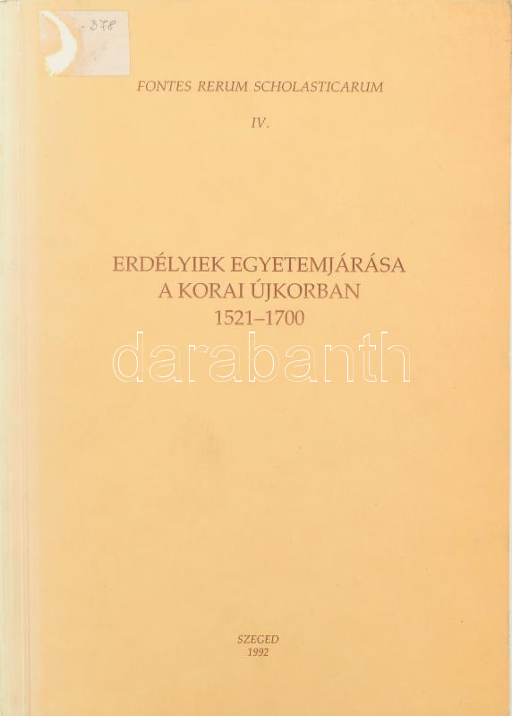 Szabó Miklós - Tonk Sándor: Erdélyiek egyetemjárása a korai újkorban 1521-1700. Fontes rerum scholasticarum IV. Szeged, 1992, József Attila Tudományegyetem. Kiadói papírkötés, intézményi bélyegzőkkel, volt könyvtári példány.