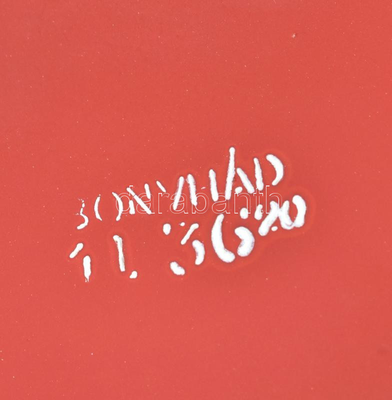 Leírás: Bonyhád vérvörös színű zománcos tejes kanna, jelzett, kopásokkal, m: 21 cm