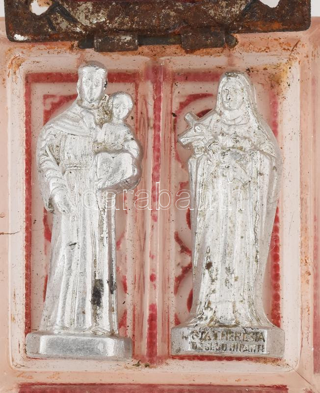 Leírás: Kéthelyes kegytárgytartó, 2 szoborkával, 4x3,5 cm
