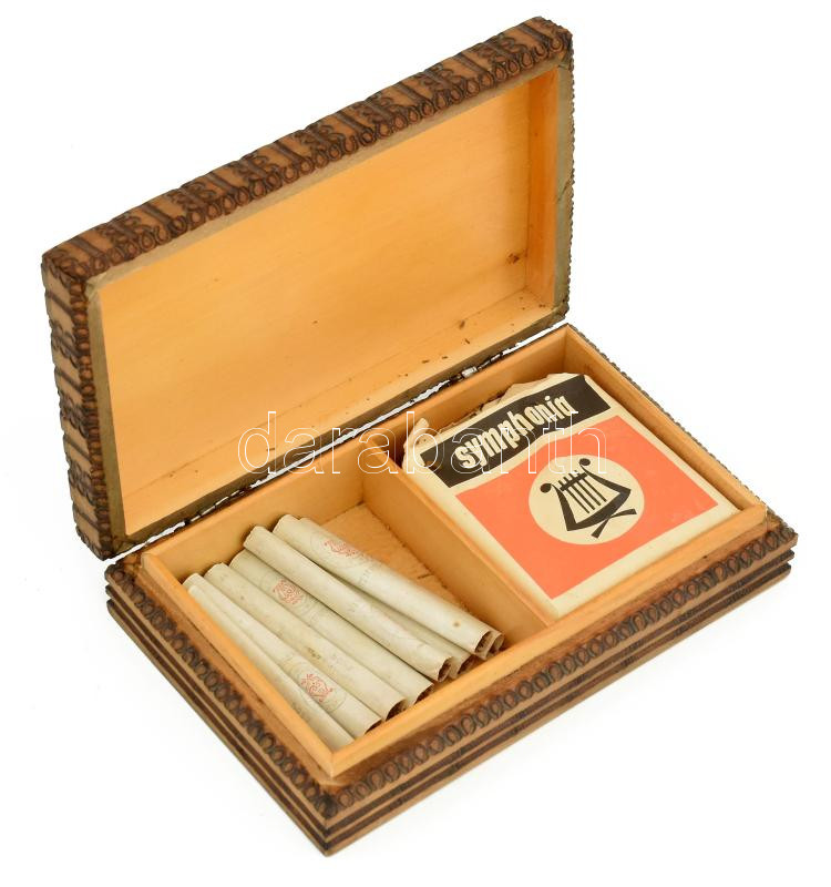 Leírás: Symphonia cigaretták, faragott fadobozban