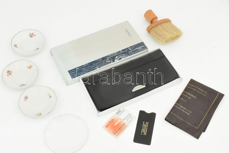 Leírás: Vegyes bolha tétel: kártyatartó mappa, ecset, porcelán- és üvegtárgyak, stb., zacskóban