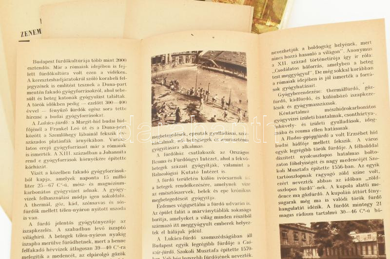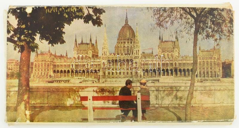1960 Budapest nevezetességeit bemutató prospektusok (Városliget, Nemzeti Múzeum, Népstadion, Gellérthegy és Gellért fürdő, Országház, stb.), össz. 28 db. A Fővárosi Idegenforgalmi Hivatal kiadása. A Parlament látképét ábrázoló kiadói papírmappában, a mappa kissé sérült, viseltes állapotban.