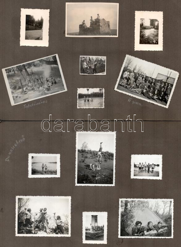 1932-1933 Újpesti cserkészcsapat táborozásáról és az 1933-as jamboree-n készített néhány fotót tartalmazó gyűjtemény albumlapokon és kivágásokon, legalább 20 db cserkészfotóval