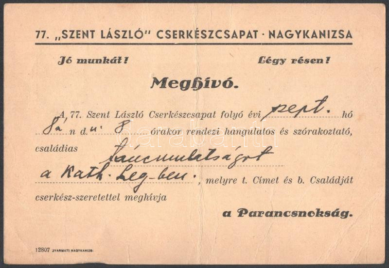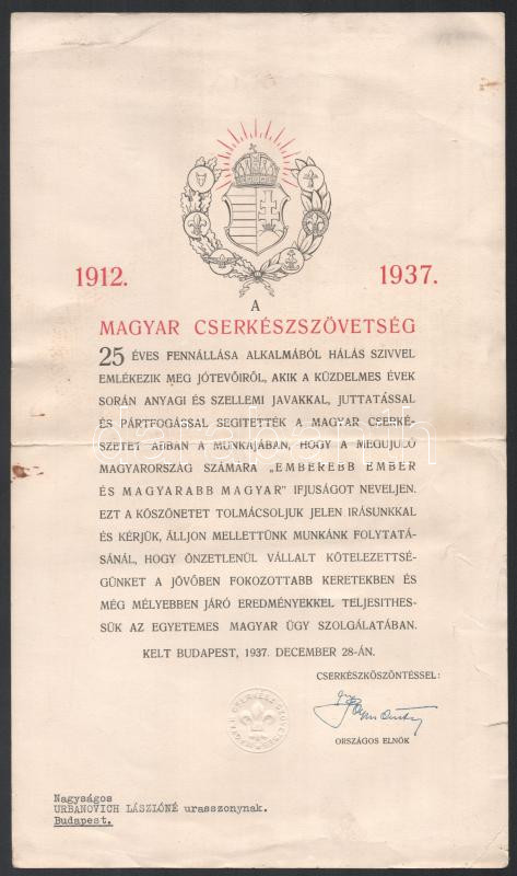 1937 Magyar Cserkészszövetség 25 éves fennállása alkalmából küldött köszönö levél, nyomtatott aláírással, szakadással, kisebb folttal + cca 1930-40 77. "Szent László" nagykanizsai cserkészcsapat meghívója táncmulatságra