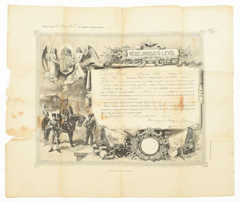 1909 Bp., végelbocsátó levél (obsit), M. kir. budapesti 2-ik népfölkelő járásparancsnokság, kismagyari Magyary Lajos őrnagy aláírásával, dekoratív grafikával. Szakadásokkal, foltokkal, 60x50 cm