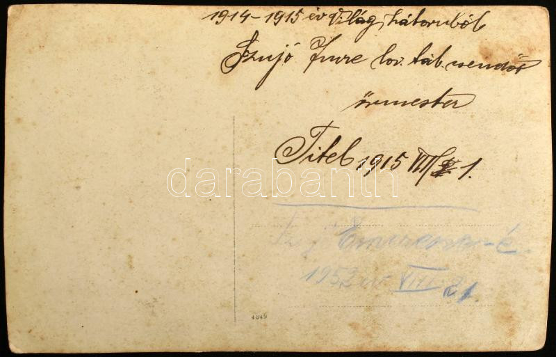Leírás: 1915 Szujó Imre lovas tábori csendőr őrmester Titel. Fotólap