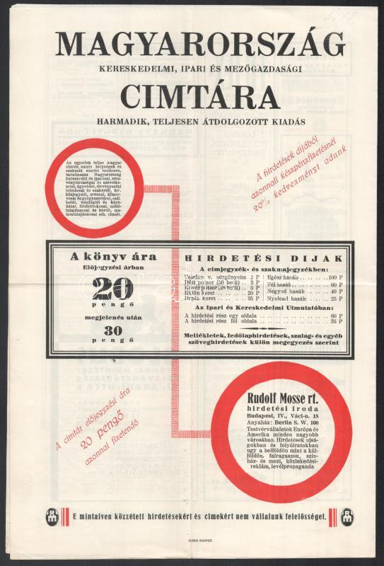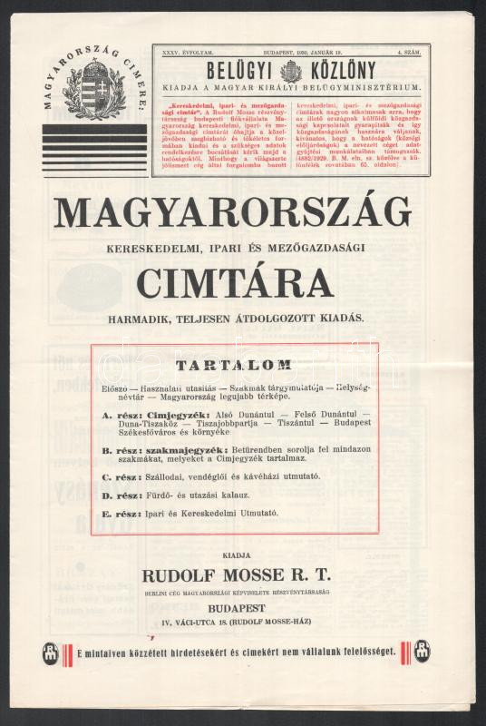 Leírás: 1930 A Magyarország kereskedelmi, ipari és mezőgazdasági címtára. 4 p.