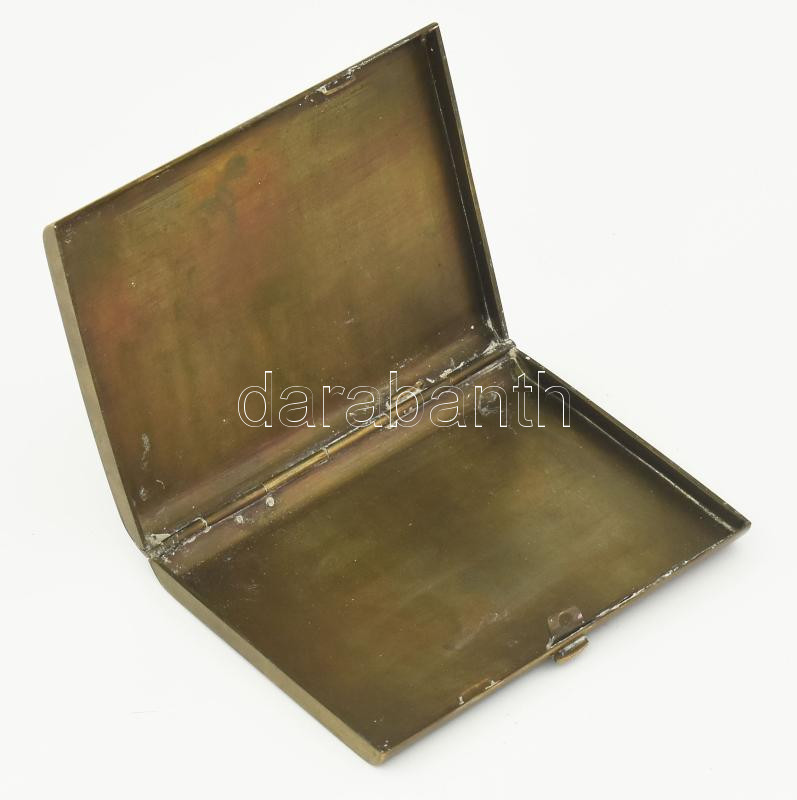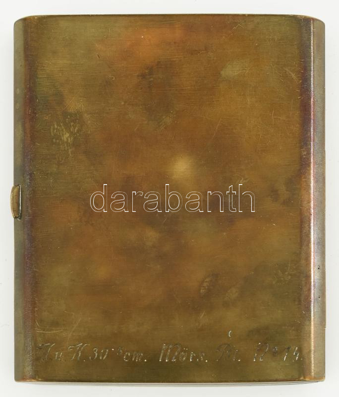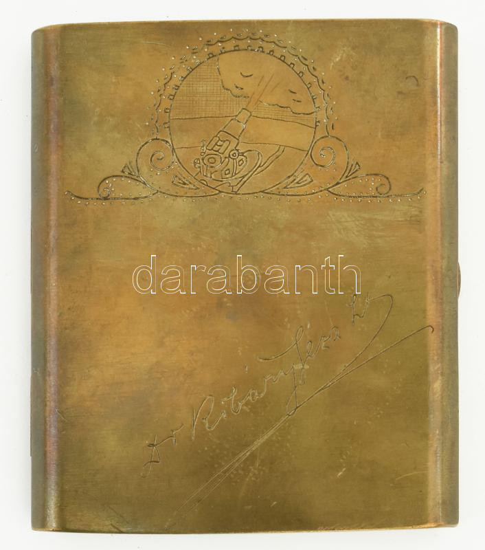 I. világháborús emlék, réz cigarettatárca, fedelén osztrák-magyar 30 és feles mozsárt (Škoda 30.5 cm Mörser) ábrázoló, vésett mintával, illetve a tulajdonos nevével: ,,Dr. Ribáry Géza Lt."; hátoldalán az alakulat neve olvasható: ,,K. u. K. 30.5 cm Mörs. Bt. No. 14." Korának megfelelő, jó állapotban, 9x7,5 cm. Dr. Ribáry Géza tüzér hadnagy, az I. világháborúban a Cs. és kir. 14. 30,5 cm-es mozsárütegnél (K. u. k. 30.5 cm Mörserbatterie Nr. 14.) szolgált; valamint egy 1915-ben megjelent, tüzér ismeretekről szóló könyv szerzője is volt. (Dr. Géza Ribáry: Richtbehelf für den Batterierichtkreis, Geschützrichtkreis, Richtkreis-Transporteur und Richtbussole. Budapest, 1915.)