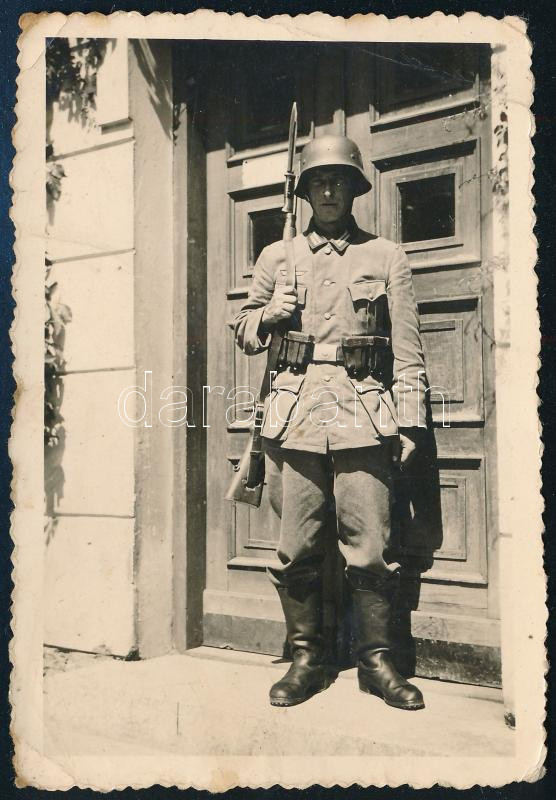 Leírás: M. kir. katona puskával, rohamsisakban, fotó, 6×9 cm