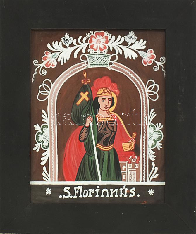 Szent Flórián. Üvegikon, XX. sz., fakeretben, 25×20 cm, https://www.darabanth.com/hu/465-Gyorsarveres/465.0/Mutargy-papirregiseg-egyeb/Mutargyak-antikvitas~500003/Szent-Florian-Uvegikon-XX-sz-fakeretben-25x20-cm-~II3135610